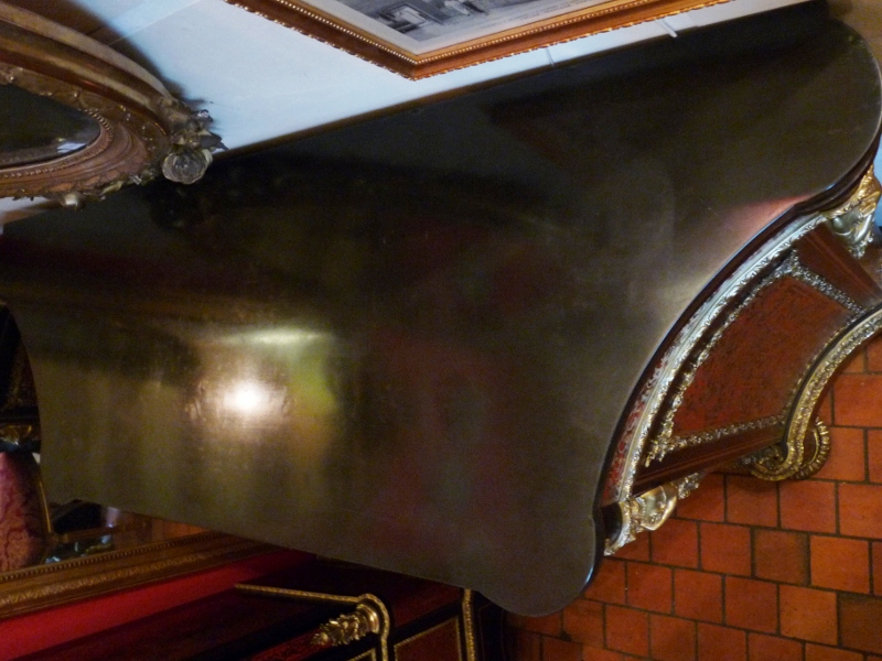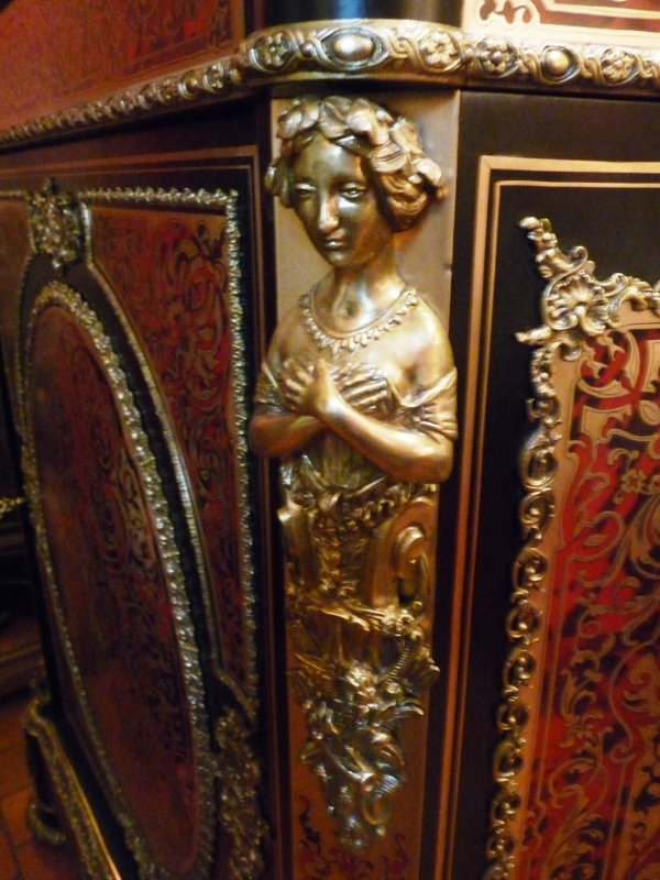 En effet, la marqueterie Boulle travaillée en écaille de tortue et laiton sur toutes les faces et les bandeaux du haut est ré-haussée de lingotières en bronze bien grasses et superbement ciselées.