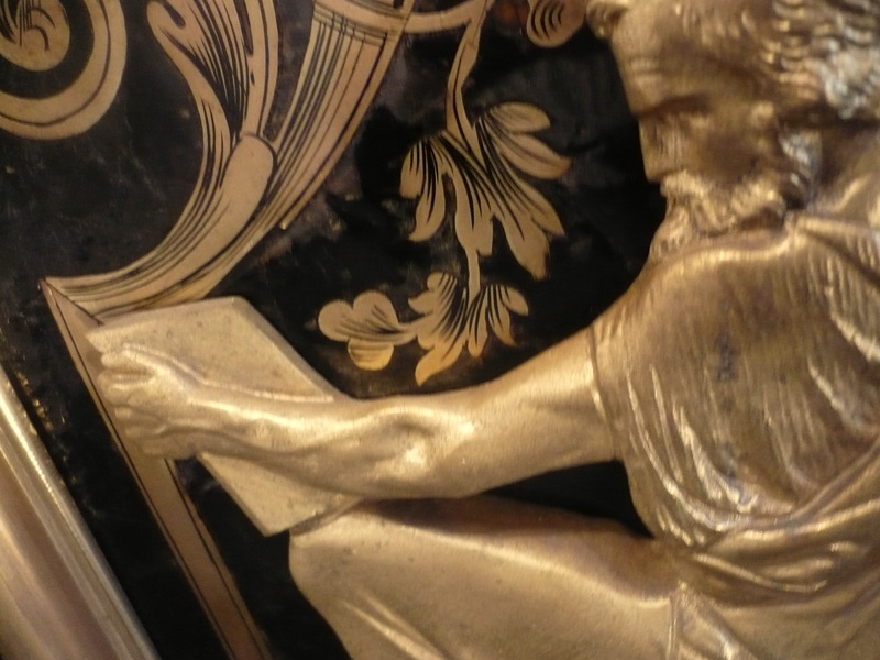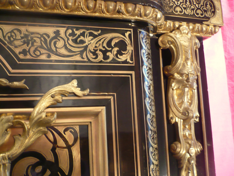 Les décors de la marqueterie Boulle avec des rinceaux et des arabesques sont de toute beauté.