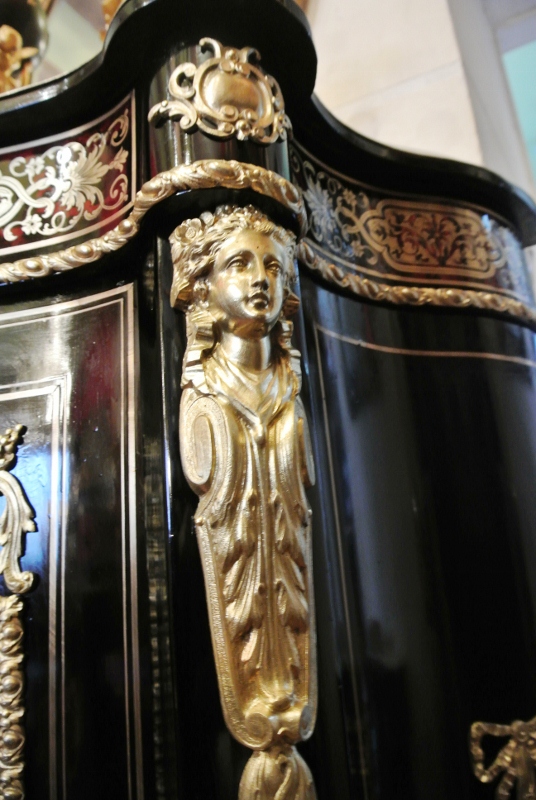 La marqueterie Boulle se retrouve sur la porte mais également sur le bandeau du haut et les bandeaux de cotés.